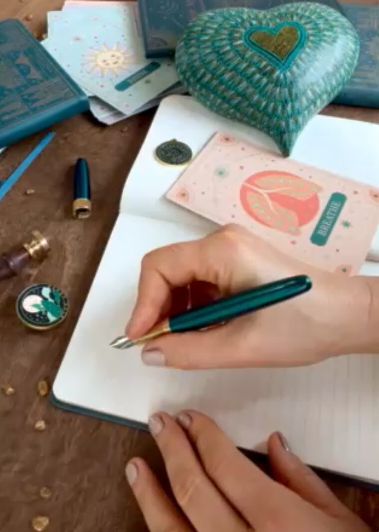 Each journal will include 30 handwritten prompts, carefully placed throughout the pages—or, if you prefer, compiled in an index at the front or back. Every single note is handwritten by me, making each piece truly one of a kind. You also get to choose the ink color: classic black, deep blue, or rich emerald green—because this journal should feel like yours in every way.